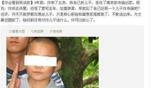 7月14日晚,网友“月寒书生”在微博中爆料:“9年前,你来了北京,将自己的儿子,丢在了南京的寺庙出家。现在,你成名成星,也有了豪宅名车、如意郎君,早就忘了自己还有一个儿子在寺庙吧?也许,你天天做梦都在想念儿子,只是担心前途和富贵家庭都毁了,不敢说出来。方丈最近圆寂了,临终前没有对你儿子说什么,你可以放心了。”