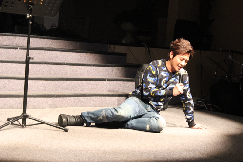 当时他怀疑地问,“有那么严重吗?”医生回答,“不信你试试看,”然后他继续回去录音,结果声带再爆血管。那天晚上,他很害怕,去了艺人团契,跟弟兄姐妹分享了这个事情,然后就哭着说,“上帝你让我回来,为什么要丢下我,让我遇到这种事情。”