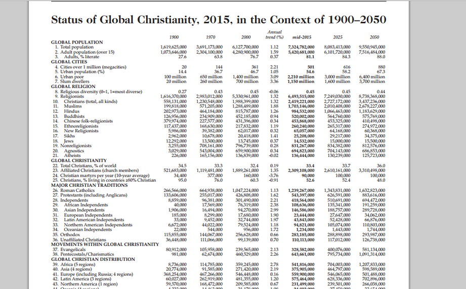 今年的全球差传数据中有一个重要的表格,是汇集了从1900年到20150年来许多重要指标的对比。基督时报查阅了制作该表格的Gordon-ConwellTheological Seminary的官网,在这个表格中,一方面统计了全球人口、全球城市数、全球不同宗教人口、全球基督教情况、宗派会友数字、各大洲信徒分布、全球基督教组织、基督教宣教、城市宣教、基督教的经济情况、基督教文宣媒体、全球宣教现况共12大方面的内容,而同时,把1900、1970年、2000年过去的数字进行了排列,并且计算出过去这100年来的年增产率,在此基础上对2015年年中、2025年和2050年做出预测。