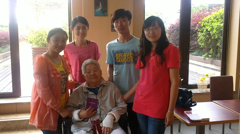 不仅如此,“杭州心连心团契”也常去敬老院做义工服务。一次,他们去医院认识了一位92岁的老人,名叫周福祥,得知家里人不常去医院看望他后,“心连心团契”义工团队便开始出动,每天都有人去探望他。并在医院给他传福音,他还接受了洗礼。虽然是高龄老人,但周爷爷的听力还很好,团契有个姐妹送给他一个圣经播放器,他可以每天听道、唱赞美诗,天天都非常喜乐。