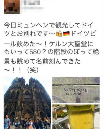据环球时报援引日本NHK电视台报道称,日前两位神奈川大学的学生在德国进行课外活动时,用笔在科隆大教堂的回廊墙壁上涂鸦。更令人哭笑不得的是,涂鸦后两人竟拍下照片传到了推特上炫耀。