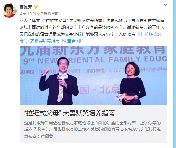 11月16日,著名教育人士、美国麻省理工学院中国总面试官、国际商务礼仪和儿童礼仪首席培训专家蒋佩蓉分享了日前她与丈夫林为千在参加新东方家庭教育高峰论坛上面讲座的全部内容。
