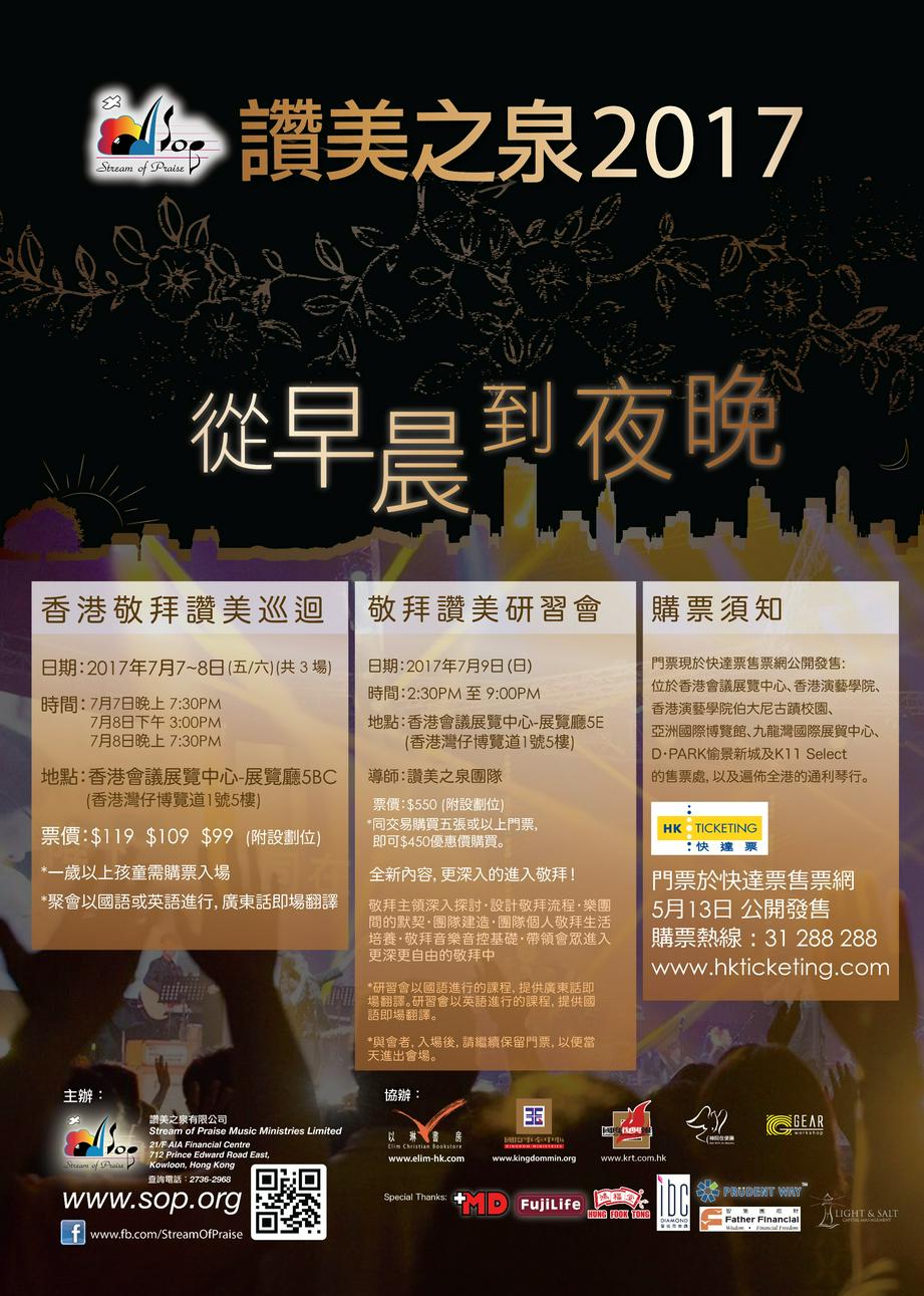 赞美之泉官网报道,赞美之泉2017香港敬拜赞美 (共三场)将分别在2017年7月7日 (五) 7:30 PM、2017年7月8日 (六) 3:00 PM2017年7月8日 (六) 7:30 PM在香港会议展览中心-展览厅5BC举行,赞美之泉敬拜赞美培训特会则会于2017年7月9日 (日) 2:30~9PM在香港会议展览中心-展览厅5E举行。