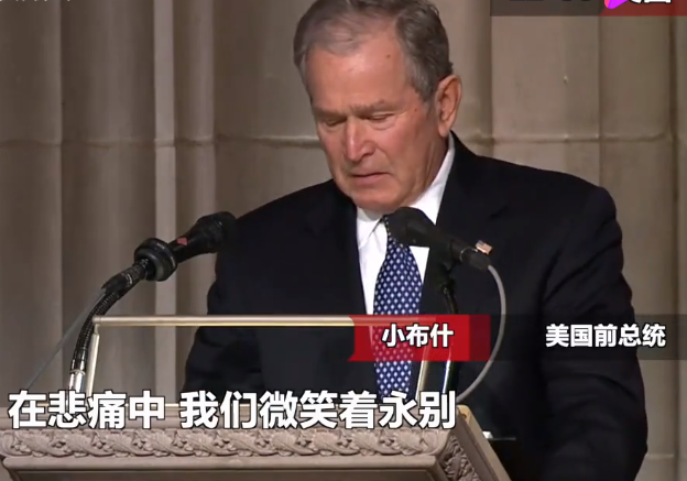 悼词结束,小布什走回座位时,途经老布什的灵柩轻轻拍了两下,似在告别。