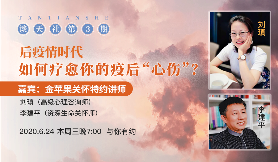 2020年6月24日晚7点,谈天社第三期邀请了金苹果生命关怀中心的资深生命关怀师李建平老师、高级心理咨询师刘瑱博士以《后疫情时代:如何疗愈你的疫后心伤》为题进行了分享。