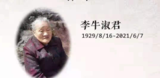 “我们亲爱的母亲李牛淑君,于主后2021年6月7日安息主怀。母亲一生跟随耶稣基督,与父亲李天恩(慕圣)一起服事当时代的人,虽历经还你,但从未退却,为我们留下极美的榜样。”在由李心慈、李心乐、李心明携家人发布的讣告中如此说到。