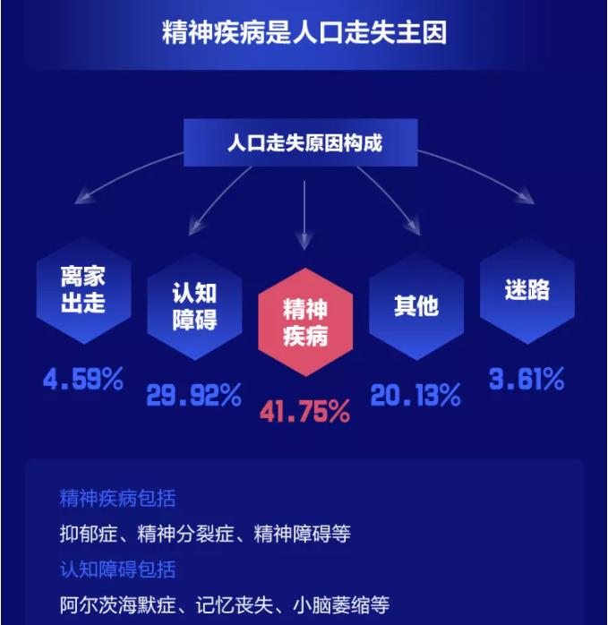 其实原因很简单,是因为很多成年人都有精神疾病。如果说老人是因为认知障碍而容易发生走失现象的话,那么成年人就是因为精神疾病。有高达41.75%的走失现象是由于走失人口有着各样的精神类疾病,包括抑郁症、精神分裂症以及精神障碍等。而精神疾病也在所有的走失原因当中高居榜首,无人能够撼动。