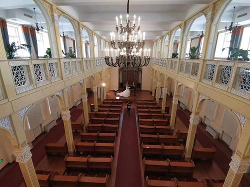 从二楼往下看,你不会觉得一楼是座音乐厅,反而会觉得这是一座教堂。因为一楼舞台上除了一座钢琴,我们看不到任何音响设备,并且有一对新人在那里拍婚纱照。了解后才知道,这是一个神奇的建筑:由于老会堂呈矩形结构,高8米多,根据声学原理,这种结构能够产生回声共振,所以可保持音乐的原有音色,所以根本不需要现代音响设备。