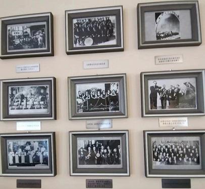 于是我们一边欣赏墙壁上的老照片,一边从右侧旋梯上二楼,上楼后,左手边的墙上有一块专门的区域记录了哈尔滨老会堂音乐厅的年代历史。同一侧的墙上还悬挂着很多曾经生活在哈尔滨的犹太音乐艺术家的照片,包括歌唱家,演奏家,指挥家等。