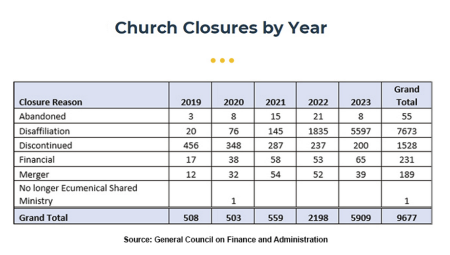 在2019年举行的总会特别会议上,代表们投票决定在《联合卫理公会教规》中增加第2553段,为因LGBT辩论而退出宗派的教会设立了一个程序。该措施于 2023 年底到期。
