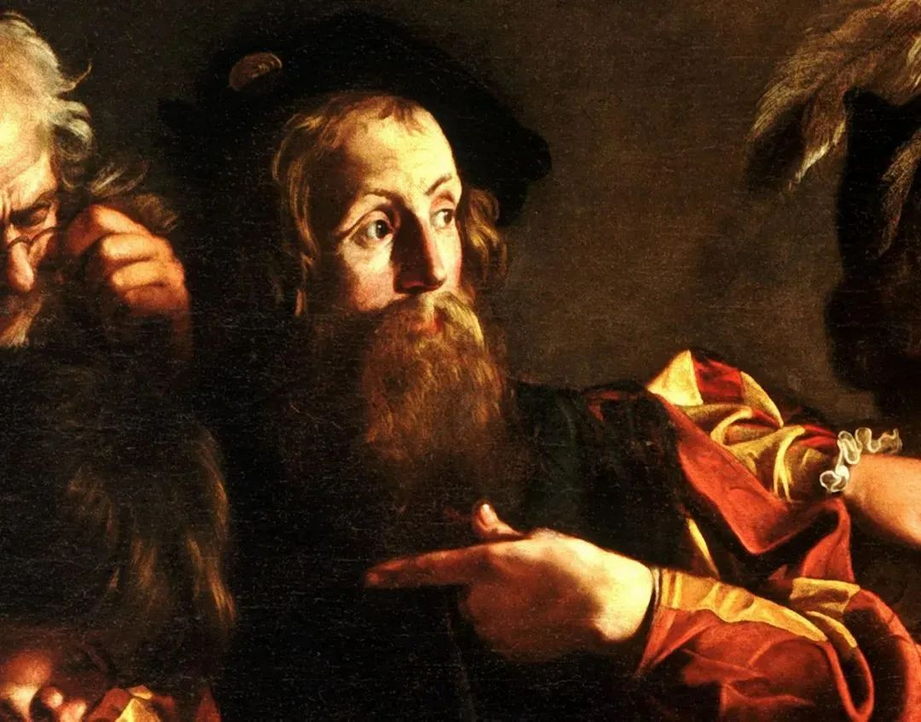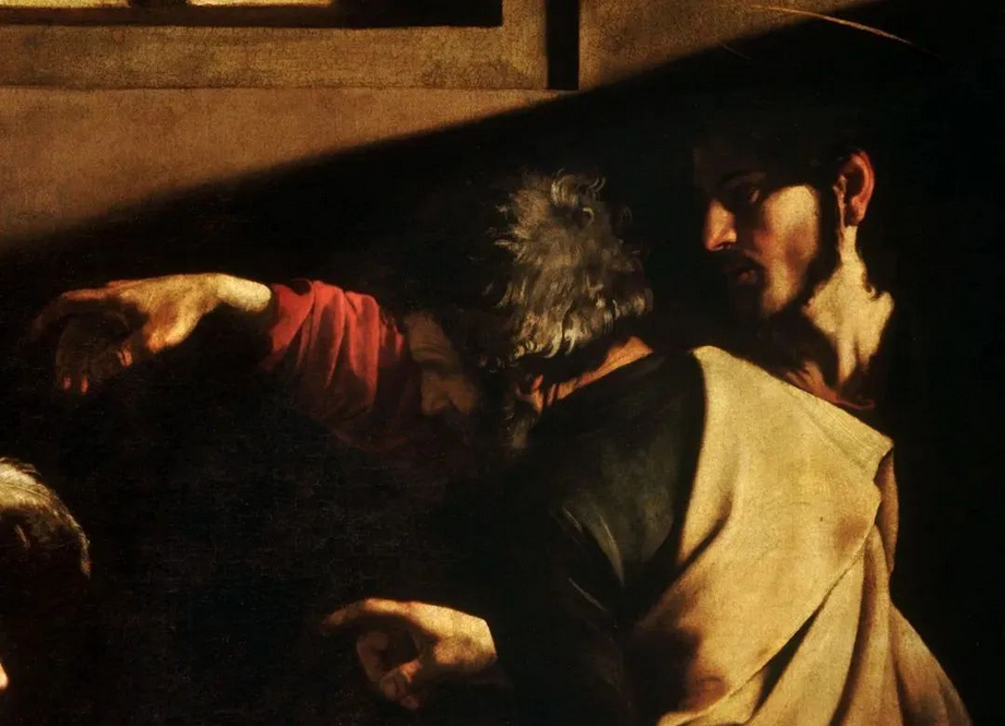 隔在耶稣和马太之间的青年士兵,转过身体,警觉地望着这两个不速之客,似乎又在观察来人。戴着羽毛帽子的青年也惊异地看着耶稣,而马太右边两人则低头点钱,不作理会。这些处理构成了强烈的戏剧性冲突,加强了人物关系的节奏感,使画面更耐人寻味、让人捉摸。这些就是卡拉瓦乔艺术的成功之处。