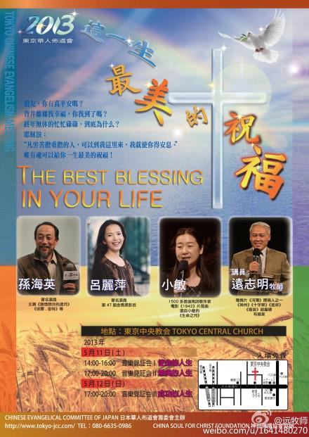 远志明牧师在微博中说:“东京地区和旧金山湾区的华人差不多,大约五、六十万。但是基督徒的比例相差悬殊:旧金山湾区至少有二、三万华人基督徒,而东京最多只有二、三千。”并把把这次题为“2013这一生最美的祝福”海报也呈现给大家。既然是华人布道会,那么海报的宣传也直入背井离乡的华人内心深处。