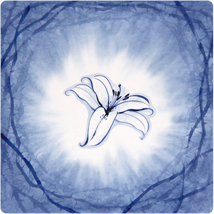 这幅《荆棘百合》是他2013年的作品,共1.5平方尺,全部用靛蓝描绘而成,加水区分颜色的层次,将荆棘冠和百合花有机地统一在一个画面中。与传统国画不同的是,这件作品中省去了落款和印章,崔马太告诉笔者这幅画完成后感觉再加落款和印章纯属多余,只要能表达信仰生命的内涵就足够了。