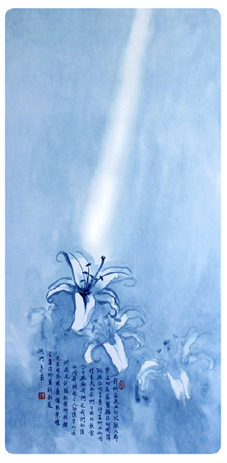 画面底下的四朵百合花象征基督徒的生命,同样温润、沉稳而雅致,蓝色的颜料渲染出神圣而圣洁的气氛,通过蓝白的虚实对比效果画出从上而下的一束白光,象征着神圣恩典的降临。上面的题字是主祷文的内容,再加上三个印章,形成完整的画面,给观者鲜明而深刻的印象。