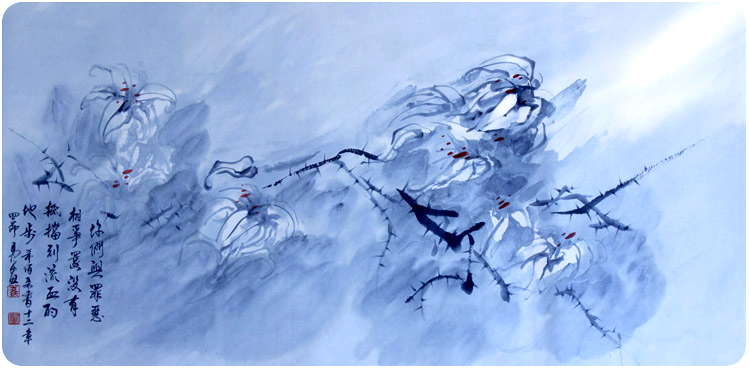 再看这幅《征战》,也是他2013年作品,共8平方尺。这件作品描绘的是百合花在遭受暴风雨袭击时坚强挺立的姿态。同样靛蓝用色,浓淡层次鲜明,使得画面的空间感得以充分体现。画面左边的百合花显得较虚,在空间上呈现出后退的效果,崔马太告诉笔者这是祷告的象征,右边的百合花迎接暴风雨的来临,之所以能够在艰难中坚强挺立,是因为依托于左边百合花所象征的祷告。所有的百合花表面上看似柔弱,但却在荆棘般的花枝上透露出一种坚强和稳重之感。百合花中红色的花蕊是鲜血的象征,正呼应左下角的题字希伯来书12章4节:你们与罪恶相争,还没有抵挡到流血的地步。同样,画面右上角一束白光正象征神圣恩典的降临。