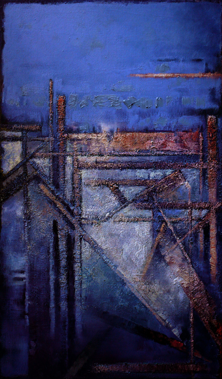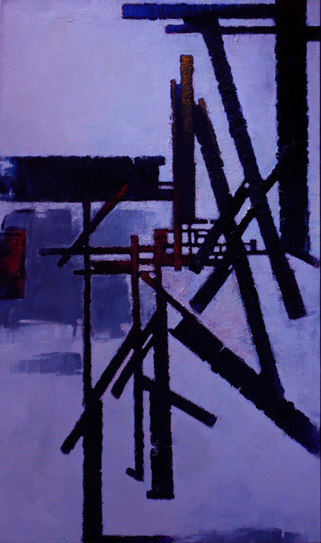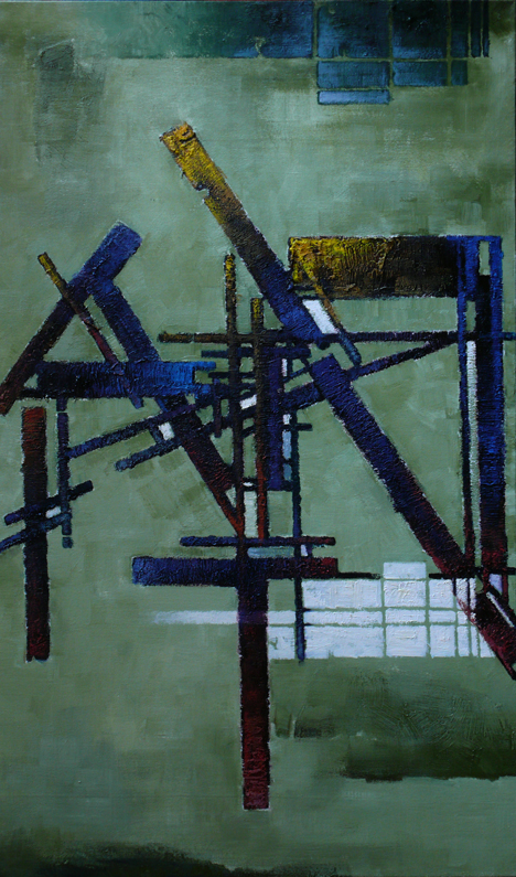 张伦的作品能够启发人思考,光影和色彩的自由变幻中透露出一种永恒与时间的辩证法。的确,当我们初读其作品时,会感到茫然而无所适从,不知从何读起,我们那带有艺术及灵性渴求的内心会被眼前画作的巨大不确定感吞噬进而变得茫然而不知所措,但是当我们抛开任何固有的观念,进而以“纯真之眼”对其加以观赏和品读并步入其中时,会感受到在琳琅满目的形色之下有着一种崇高的艺术意向。纵横交错的线条,有如刀剑或者建筑脚手架,给人以严厉的肃杀之气,那是基督的荆棘冠冕吗?那是人世间苦痛和苍凉的象征吗?抑或灵肉争战的艰难?基本的点线面等画面元素所营造出的,是一种救赎精神的显现,一种悲天悯人的壮阔之感,一种人类罪性及罪行的深沉忧虑,正如约翰福音十六章八节所昭示的:为罪,为义,为审判,自己责备自己。有的作品全部用只硬的长方形色块组成,色块边缘处理成锯齿的效果,像是着锈的钢条,又像是剪成的纸条,在脆弱和破败之中给人以苍凉和挺壮的感觉。难道这不是基督徒生命的象征吗?神的儿女在肉身的软弱之中降服于主恩,在灵性的救赎中得到生命的释放,在信心之中得以战胜整个世界,我们在世是脆弱的,但靠着基督为我们流出的宝血,我们从软弱中变为刚强。耶稣基督本是神子,却谦卑虚己,道成肉身来到充满的黑暗的世间,成为光却不被世间的黑暗接受,他在世间尝尽了人类软弱的滋味,最终却在荣耀中复活并彰显神的权能。正如哥林多后书十二章九、十节所说:“祂对我说:‘我的恩典够你用的,因为我的能力,是在人的软弱上显得完全。’所以我更喜欢夸自己的软弱,好叫基督的能力覆庇我。我为基督的缘故,就以软弱、凌辱、急难、逼迫、困苦、为可喜乐的,因我什么时候软弱,什么时候就刚强了。”软弱与刚强的辩证法,应当在神儿女的身上得到充分的证验,基督徒的软弱因为神爱的信实而在恩典之中变为刚强。值得注意的是,张伦作品中的线条虽然有的凌乱而多变,但是背后总有一个隐约的架构在支撑着,这个架构仿佛就是一个十字架的造型,在整体构图上是呈现十字形的,这寓意着基督恩典的根本性和实在性,人世的一切现象只不过是神恩一步步彰显的结果,这些现象的背后却有一个绝对他者的恒定在场。