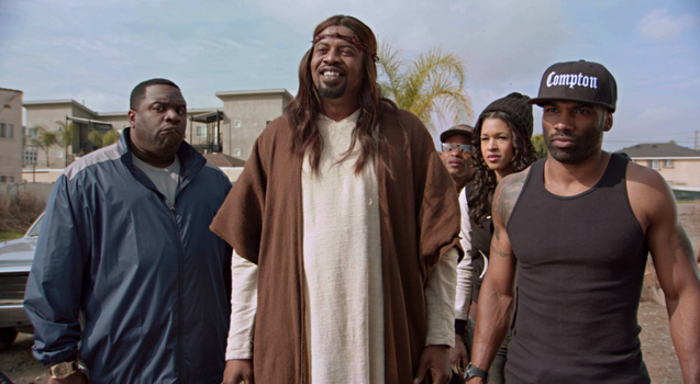 《黑人耶稣》中耶稣的扮演者是杰拉尔德·斯里克·约翰逊,巨大个头长发。片中,他经常与小个子不成器但却忠诚的同伴们出去爽一下,闲逛着,又鼓励人做点好事情——像建一个社区花园(他们本来也可以在那里种大麻)。但在吸食大麻后,引爆F炸弹,约翰逊扮演的耶稣给人的印象是以真诚的态度来传播他的使命、传播爱和仁慈,向他天上的父显示出至高的信心,盼望他的同伴和康普顿公园的邻居摆脱空虚,贪欲及自私的方式。