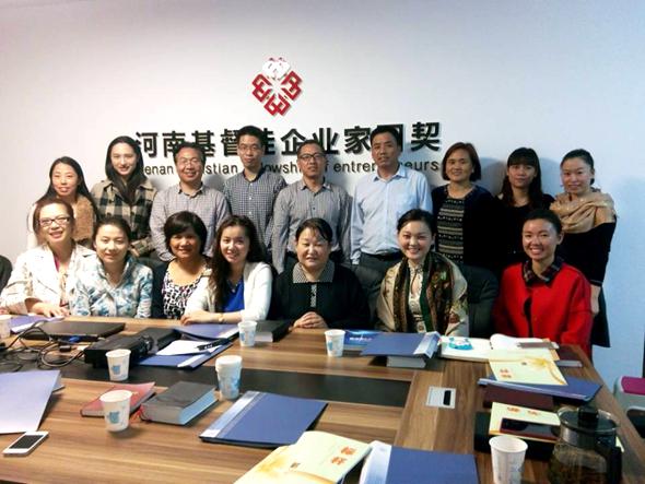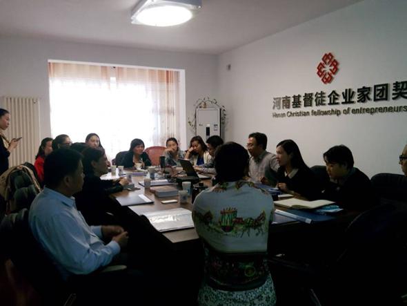 2014年10月26日下午,河南基督徒企业家团契特邀河南康亨服饰有限公司董事长梁俐姐妹和河南德盛耐火材料有限公司董事长景夫生弟兄来团契分享天国企业经营理念与其个人生命见证。