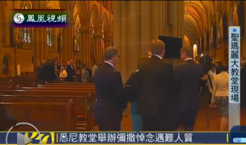 凤凰卫视消息,16日就在事件发生的第二天,位于澳大利亚悉尼的圣玛利亚大教堂举行了悼念的弥撒,当地的天主教教区主教和民众一同祈祷。主教说:“不管任何的种族、宗教、政治,大家都聚集在一起为遇难者默哀。”