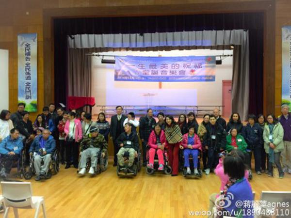 当日,蒋丽萍也在微博中透露了这一信息。微博原文:“12月14日由回声谷伤健福音协会主办的「一生最美的祝福圣诞音乐会」当中欣赏到行动困难的伤残人士落力的表演赞美操、福音粤曲,真是另人佩服!Agnes见证分享鼓舞人心,充满从神而来的怜悯、关爱实在令在场人士非常感动。最后看见愿意决志的弟兄姊妹一个一个的坐著轮椅出来的时候真的很感动,感谢主!”