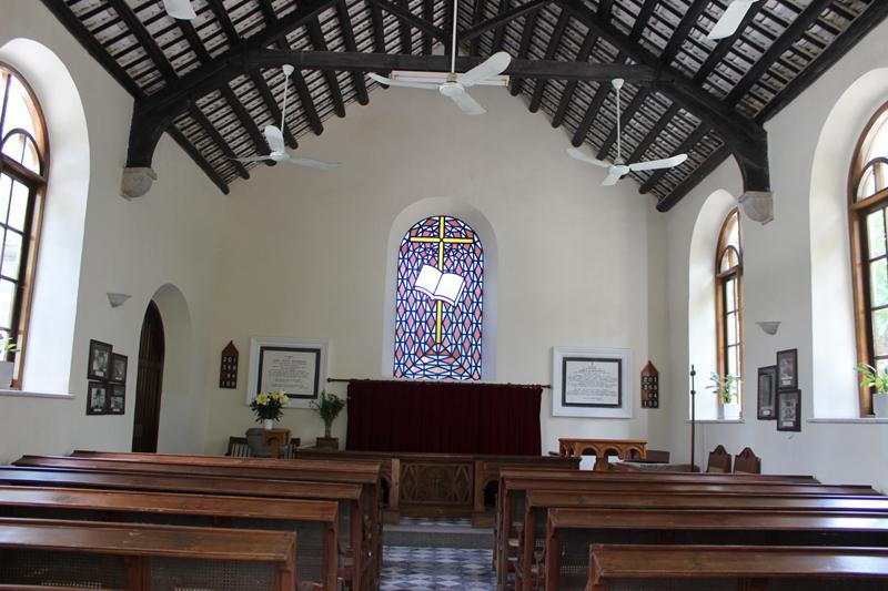 当基督时报的同工沿着路边的指示牌走进大门时,一幢淡雅的白色建筑映入眼帘,这所罗马风格的小圣堂面积约80平方米,一层高,平面长方形,窗门为拱形设计,别具匠心,室内装饰简单整洁,置有十几张长藤椅。顶部保持着年代久远的屋梁,屋椽与几把长吊扇,十分别致有趣。
