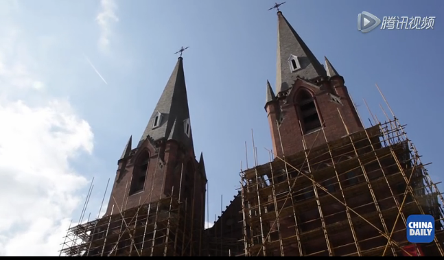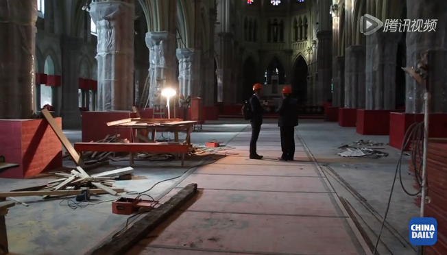 徐家汇天主教堂目前室内室外修缮的现场。(图:中国日报视频截图)