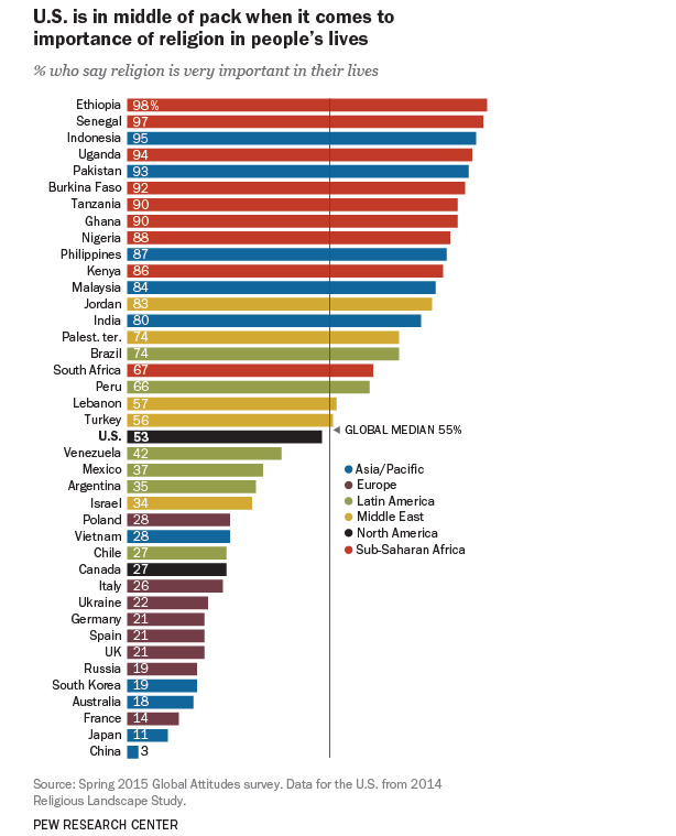 2015年底,皮尤调查中心公布了一个“全球各国重视宗教信仰”的调查,其中列出数十个国家的人民对“宗教在生活中的重要度”的态度,其中最虔诚的是埃塞俄比亚,98%的人认为宗教在他们的生活中很重要,第二名是西非的塞内加尔(97%),第三名是亚洲的印度尼西亚(95%)。