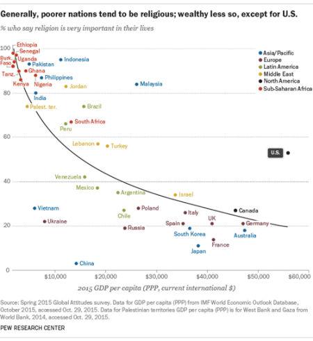 此报告同时还提到,对于大多数国家,该比例与人均GDP表现出负相关的关系,即越信宗教的国家经济越落后。但令人意外的是,在所有调查对象国中,中美这两个大国偏离此规律最远。