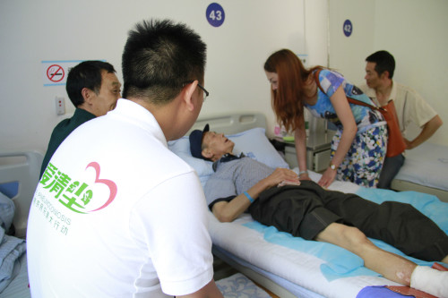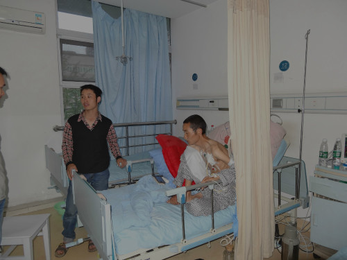 2015年5月11日下午,四川成都。1986年出生的任*(图中左起第三位)病重无法呼吸。他哥哥借钱转三次救护车送到华西四医院,花费车费二千多。5月12日即手术。大爱清尘四川志愿者到医院看望,他骨瘦如柴,无法躺下呼吸,每天依靠制氧机维持呼吸。尘肺病尚无根治药物,一般采取洗肺手术和保守治疗来控制病情进一步发展。只要医疗跟进及时,救治措施到位,掌握康复技能,可以缓解患者病情并拯救其生命,甚至可以让其恢复简单劳动能力。大爱清尘自2011年6月15日大爱清尘创立至2015年5月11日,我们累计救治尘肺农民1344人。然而,因为尘肺病的不可治愈,仍然有患者的生命无法坚持更久。在已救助患者名单之外,湖北口乡、陕西镇安、四川宜宾、四川凉山州、云南邵通、江西修水、湖南安化、贵州仁怀、贵州思南、河南嵩县……存在着大量我们未能了解情况的尘肺病农民,他们大多居住于偏僻山村,与外界的联系少之又少。随着日益增加的患者求助信息申请,我们急切地认识到:需要投入更多更稳定的力量来帮助这个群体。