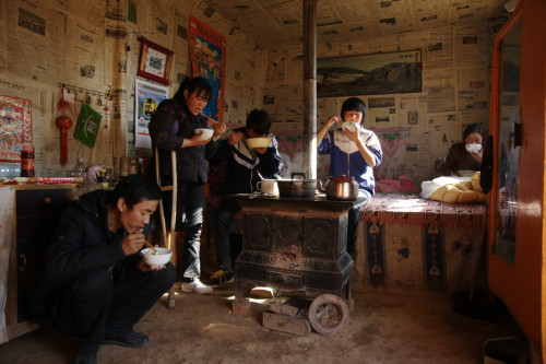 2015年5月8日下午,甘肃古浪。曾经的维权斗士、曾经的患者榜样,古浪尘肺病农民 赵*海(图中左起第一位),因医治无效于下午三点离开人世。几年前,赵*海患病后,丧失劳动能力的他曾带领家人开设网店创业,以期改善困难的家庭(其妻腿部残疾)。然而,赵最终还是没能逃脱尘肺病的折磨,留给家人无尽的伤心痛楚。