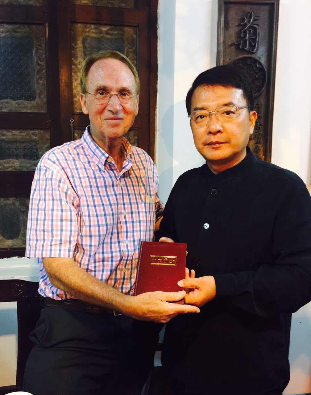 陈浩武给柏格理的孙辈史蒂芬赠送苗文版的《圣经》。(图:基督时报/陈浩武提供)