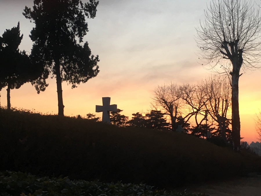 笔者和友人到达杨华津墓园时,恰值夕阳西下、宁谧与静默,抬眼看到山顶一座十字架墓碑巍然矗立于落日余晖之中,肃穆而壮丽之感直撞胸怀。