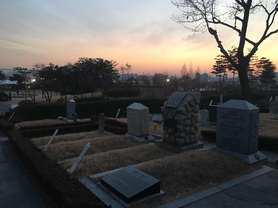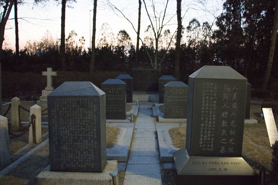 走进墓园,一排排墓碑迎面而来,这里安息着83位新教传教士和他们的38个儿女。他们来自于美国、英国、澳大利亚、加拿大、比利时等不同的国家,是19世纪末20世纪初时最初来到韩国传播福音的人,他们带着“想拯救不认识耶稣的朝鲜的百姓”的心,漂洋过海来到远东这个小小的国家,传福音,建教堂,办学校、医院和报馆,最终自己、以及自己的配偶与子女也埋葬在了这里。