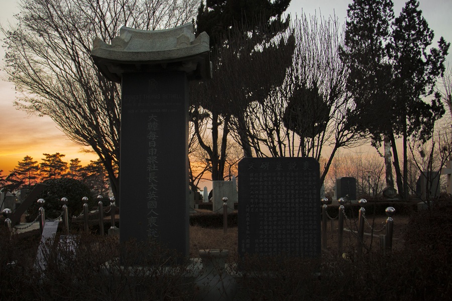 创办了《大韩每日申报》的Ernest Thomas Bethell的墓碑,他和韩国百姓一同反抗日本帝国主义的暴行,得到韩国人民的尊敬。