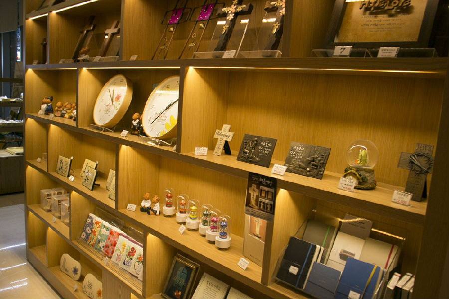 穿过“爱的教会”入口处玻璃门,迎面而来的是一楼的书店,温馨精致,文化气息浓郁,柔和的灯光中摆着丰富多彩的基督教书籍、礼品和各种用具,比如书签、圣经皮套、灵修本、水杯等。书店旁边是咖啡店,信徒们三三两两的在这里看书、聊天、分享和休息,让人感到繁忙都市生活中有这样一个节奏慢下来的空间,是件幸事。