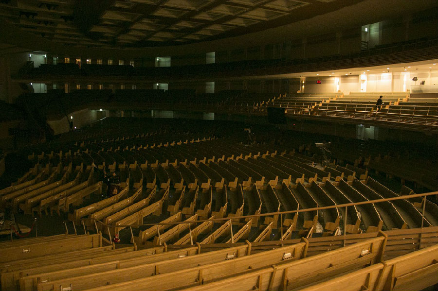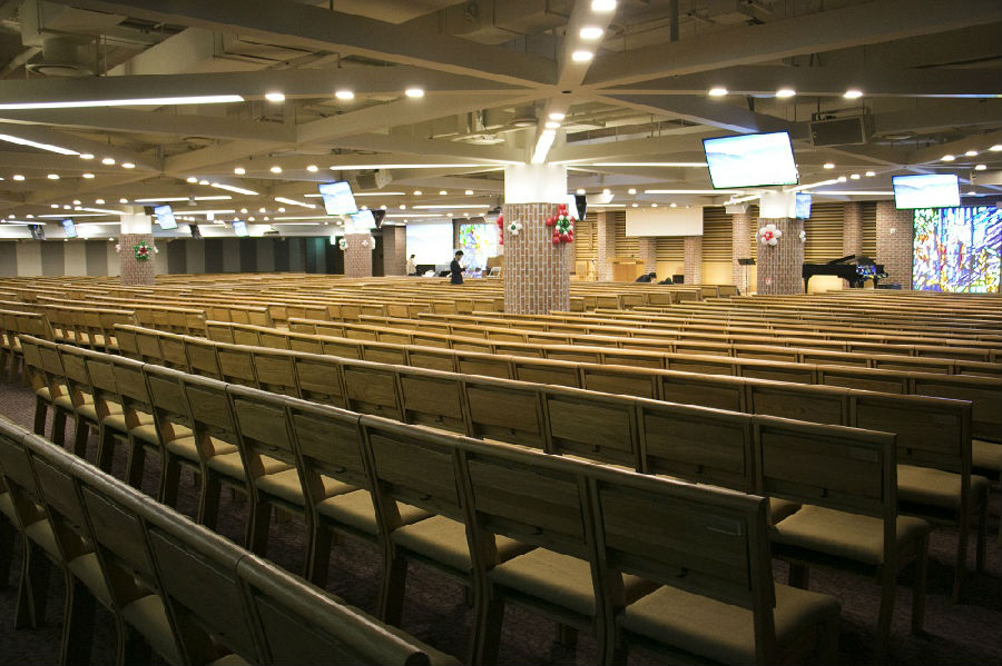 乘着电梯一直下到地下4楼,从这里到地下一层是教会礼拜的圣殿。因为不是聚会的时间,整个圣殿空无一人,非常静谧。带领浏览教会的一位牧师介绍说,圣殿有6700个席位,主日四堂礼拜都是满席,教会特别把座椅设计成浅绿色,是因为让信徒礼拜天坐在这里聚会有一种在青草地上安息的感觉,仿佛大卫在诗篇23篇写的“他使我躺卧在青草地上,领我在可安歇的水边。”