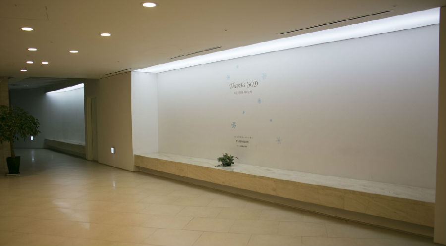 “每周要来3、4万人,所以空气很重要。”这里是地下约20米的地方,因此要好好处理冷气和热气的问题;而且特别采用了自然光调节的设备,让人即使身处地下,光和气都十分自然。圣殿的顶部安装了数十块的彩绘玻璃,并且天花板处的通光玻璃们就处于地表,夜间当从下望时,景色迷人,令人难忘。