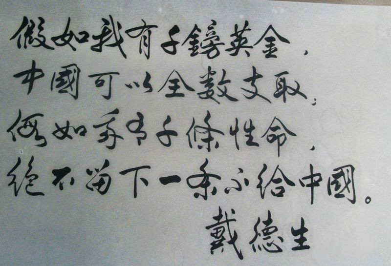 戴德生,是中国教会史上具有历史性地位的人物,他是中国内地会的创造人,中国内地会的使命是向中国的内地传福音拯救灵魂。他自1853年来华直至卒年,倾其毕生于中国福音事工。他对神绝对的顺服和信靠,给内地会的建树和中国教会的产生,带来神丰富的祝福。他最有名的话是来自于从中国写给妹妹和妹夫的信中这样一句肺腑之言:“假使我有千镑英金,中国可以全数支取;假使我有千条性命,决不留下一条不给中国。”