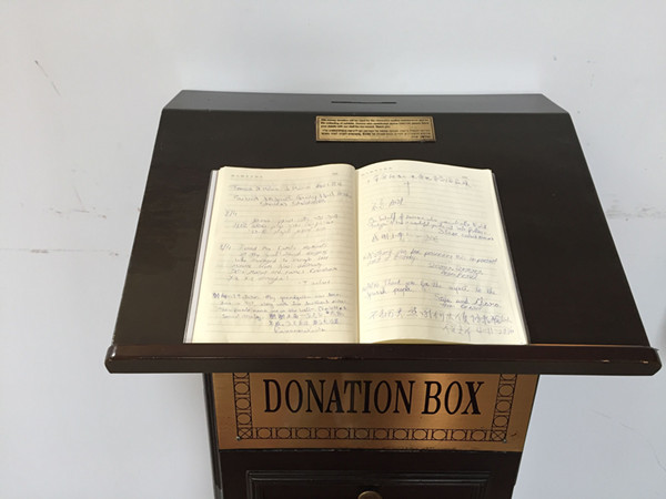 会堂门口的留言板,上面用各个国家的文字记录着对会堂的观后感。