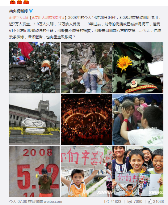 8年过去,今天中国社会各界在社交媒体上纪念当年的灾难,缅怀逝者。