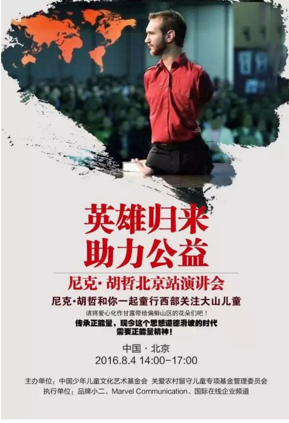此次尼克·胡哲2016年北京演讲大会由中国少年儿童文化艺术基金会和关爱留守儿童专项基金管理委员会主办,届时尼克将在北京发表主题为“英雄归来 · 助力公益”的大型公益演讲。此次的《英雄归来·助力公益》——我和你童行西部演讲大会,主要目的是把企业经济与教育资源结合起来,呼吁更多社会人士参与公益活动,让社会多一份真情,让明天更美好。