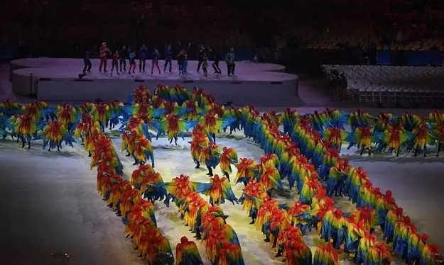在精彩的闭幕式表演中,200多名演员打扮成鸟的样子,这群鸟人舞台首先摆出基督山的样子,随后又变身成耶稣像,显得十分神圣,随后鸟人又变成里约标志性的面包山,里约奥运会的会徽图案也被演绎,最后,鸟人组成的图案以一个五环图案收尾。