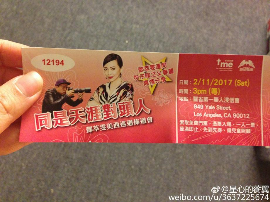 2月12日,邓萃雯又前往洛杉矶的唐人街(Chinatown),在圣盖博谷第一华人浸信会做下一场布道会。圣盖博谷第一华人浸信会教会网站曾发布预告说,港星邓萃雯姊妹及香港狗仔队之父春丽弟兄,将在本会举行两场主日布道会(下午3:00粤语,5:00国语)。