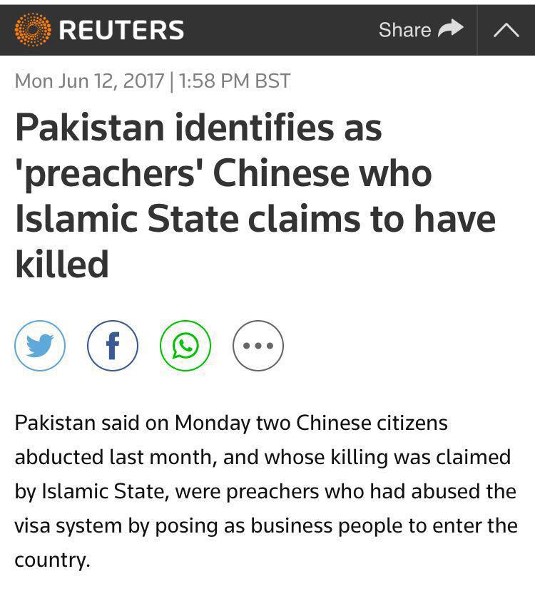 6月8日时,路透社曾报道,ISIS组织新闻社称该组织杀死了5月24日在巴基斯坦西南部的俾路支省绑架的两名中国公民,这两人是在当地一所私立语言学校教学的老师。