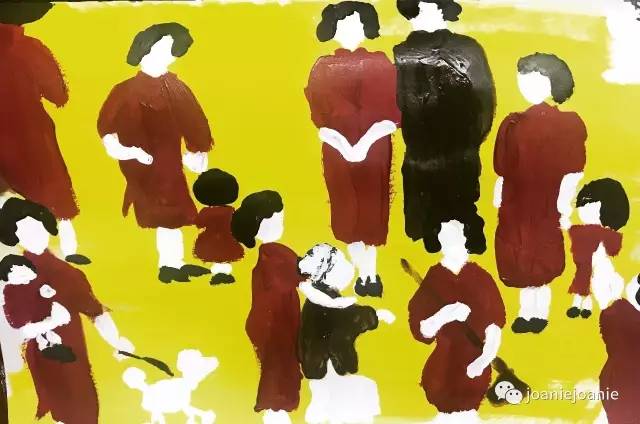在我历经忧郁的时候爸爸意外查出了癌症,家人考虑到我的病情都不敢告诉我真相,当时全职家庭主妇的妈妈的坚强对于我来说是一个神迹般的依靠,在之前照顾了奶奶,外公和外婆之后,妈妈又开始照顾爸爸和我。将近10年以来我和妈妈的关系都很像保持距离相敬如宾的刺猬,想要惺惺相惜却又怕互相伤害。于是当时仍然充满无力感的我为了表达对妈妈的朴素的巨大的爱画了一幅画:在极其明亮的明黄色的颜料背景上,是穿着优雅酒红色的妈妈的若干个身影:酒红色连衣裙的妈妈推着轮椅照顾白发苍苍的外婆,酒红色连衣裙的妈妈抱着婴孩时期的我走在大街上,酒红色连衣裙的妈妈和爸爸并肩而行在他们的年轻岁月,酒红色连衣裙的妈妈正在拖地板,酒红色连衣裙的妈妈带家里的狗狗散步,酒红色连衣裙的妈妈做完了家务在家里等待爸爸下班和我放学回家,酒红色连衣裙的万能妈妈。