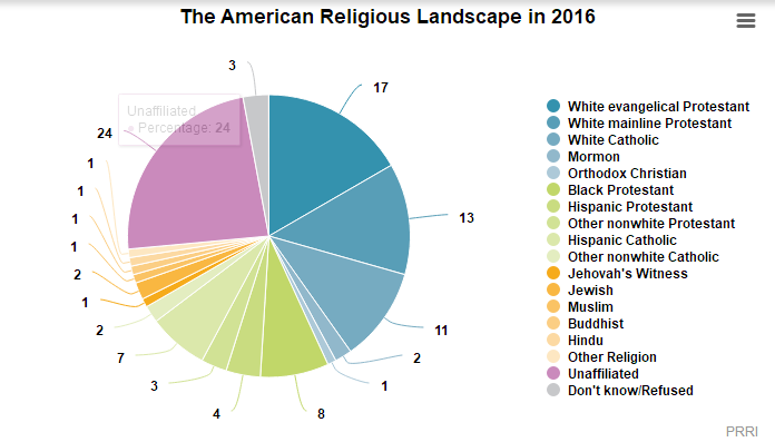 该调查抽查了全美50个州中抽取了超过10.1万人进行调查,发现当前只有43%的美国人是白人基督(天主教&新教)徒,白人新教徒在美国人口比例中占三成。。调查写到:“现在,白人基督徒不到一半的人口。今天,只有43%的美国人是白人基督徒,30%的是白人新教徒。1976年,大约十分之八(81%)的美国人是白人,并隶属于某个基督教派别,大多数(55%)为白人新教徒,白人福音派新教徒正在衰落——白人主流新教徒和白人天主教徒也一样。白人福音派新教徒曾被认为会有更长的趋势,但在过去的十年,他们的数量大幅下降。”其中,只有17%的美国人是白人福音派新教徒,低于2006年的23%。