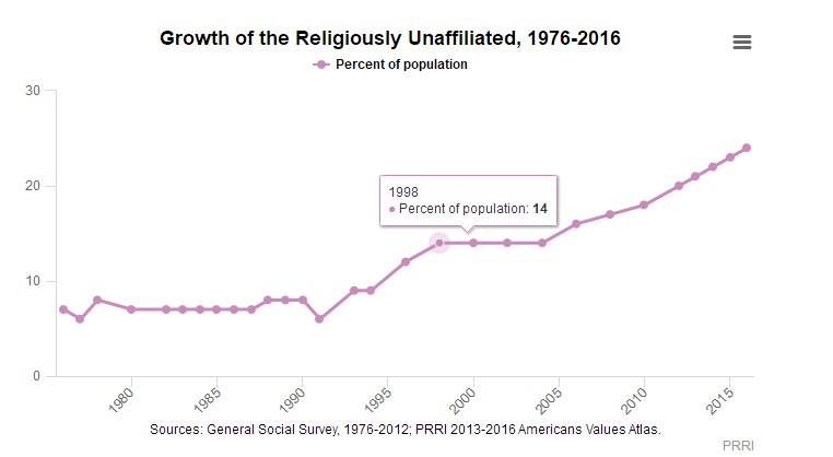 白人基督徒在美国人口比例如今不足50%,与之对应的则是无宗教归属者的崛起。