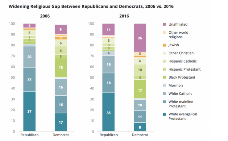 调查发现,民主党中白人基督徒比例已经从十年前的50%下降至如今的29%,18-29岁的民主党人中仅有14%为白人基督徒。而在共和党人中,约有73%属于白人基督徒宗教团体,尽管白人基督徒的比例跌破50%。
