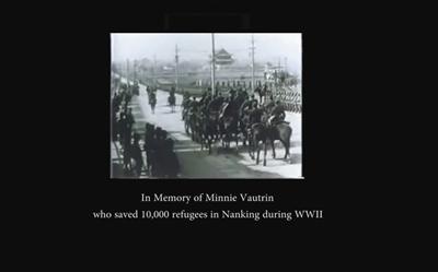 而在短片最后,出现的是:“纪念在二战中解救上万南京人的明妮·魏特琳”。