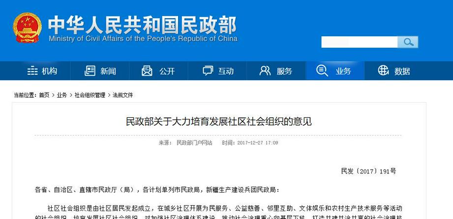 1月8日,中国民政部公布了日前下发的《民政部关于大力培育发展社区社会组织的意见》,提出:到2020年,实现城市每个社区平均拥有不少于10个社区社会组织,农村每个社区平均拥有不少于5个社区社会组织;再过5到10年,社区社会组织管理制度更加健全,成为创新基层社会治理的有力支撑。